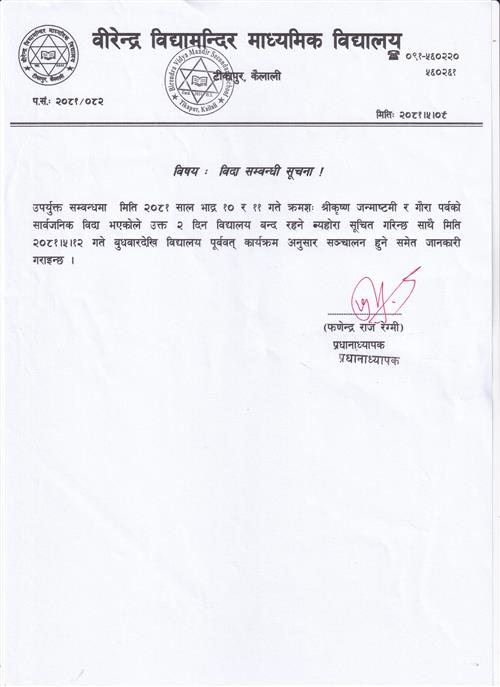 श्री कृष्णा जन्माष्टमी तथा गाैरा पर्वको विदा सम्बन्धी सूचना